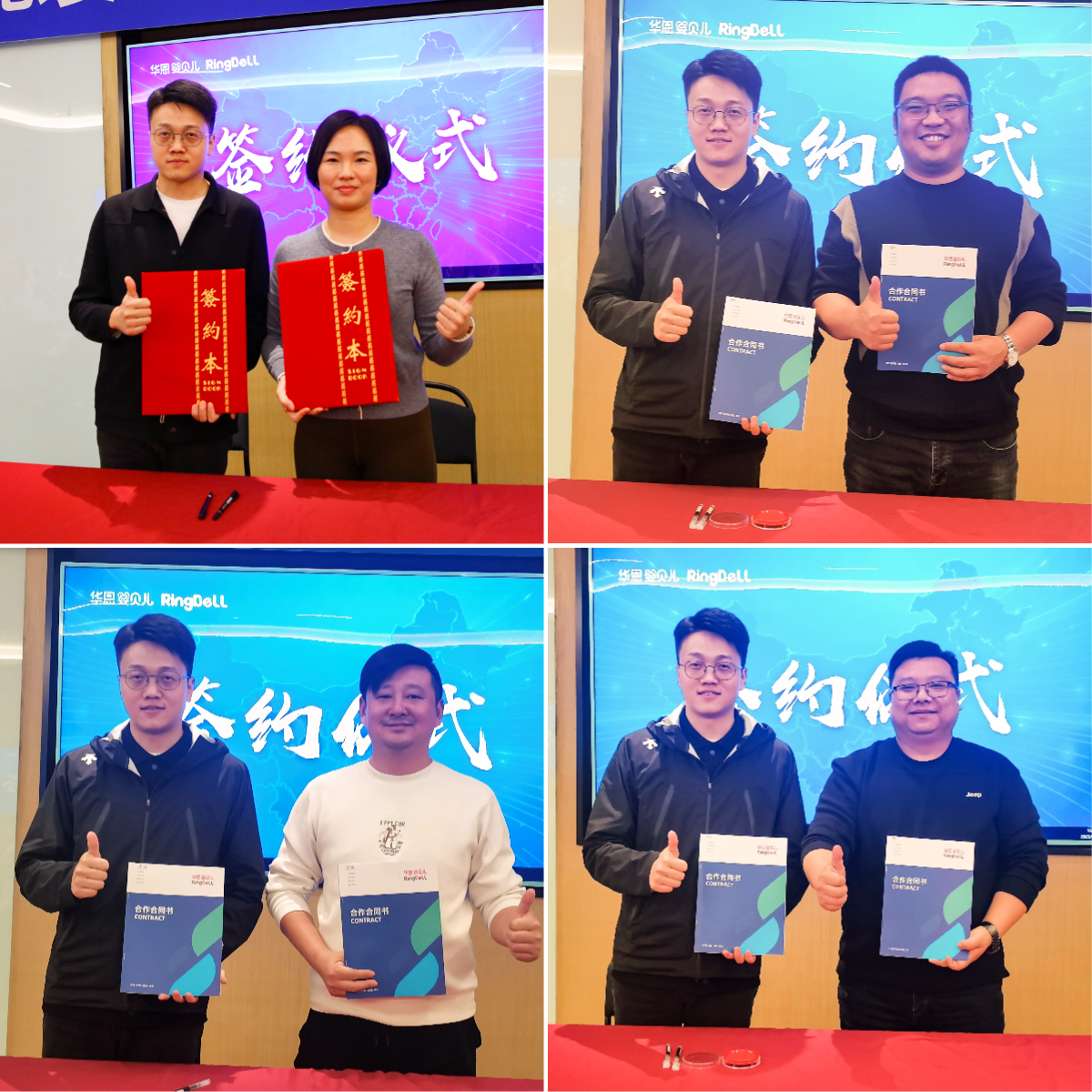 签约仪式上,湖北大区总经理韦康与武汉小悦町老板贺宇兰、枝江爱贝儿老板刘鹏志、宝贝一家亲老板章磊、宜都点点爱老板杨玉共同签署合作文件。